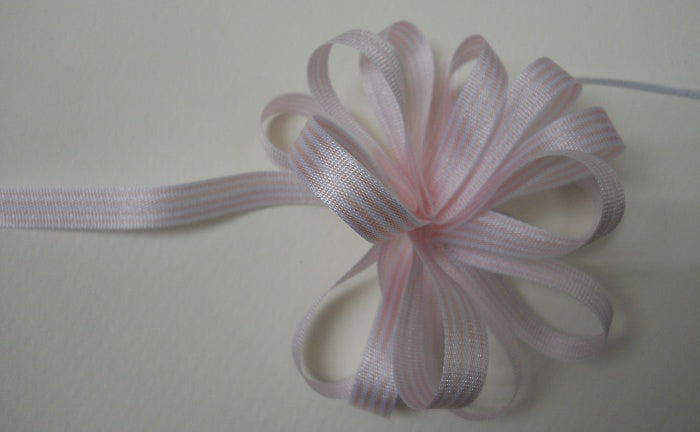 Nastro "Millerighe" rosa e bianco in raso con tirante centrale per creare coccarde ideali per decorare bomboniere (per una coccarda come quella in immagine, è necessario circa 80 cm di nastro). H 8 mm