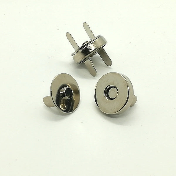 Chiusura magnetica in metallo color nikel con alette ripiegabili per il fissaggio. Diametro 20 mm. Ideale per borse, sacche, astucci, etc