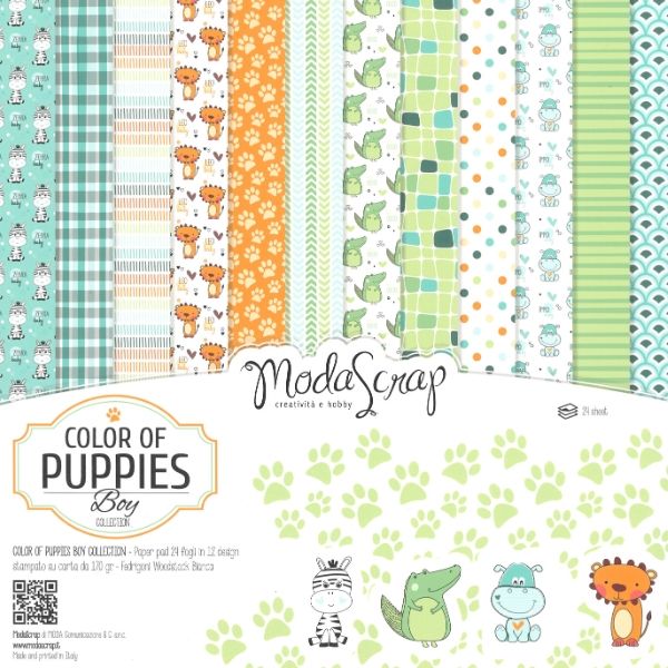 Le fantasie di Color Of Puppies Boy Collection sono un disegno esclusivo di Moda Scrap. La stampa (solo su un lato) è su carta di altissima qualità Fedrigoni Woodstock bianca da 170 g/m2, riciclata (80% da fibre di recupero e 20% di pura cellulosa ECF), colorata nell'impasto con pigmenti resistenti alla luce e con finitura liscia.
