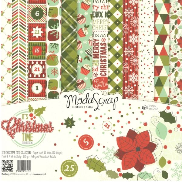 Le fantasie di It's Christmas Time Collection sono un disegno esclusivo di Moda Scrap. La stampa (solo su un lato) è su carta di altissima qualità Fedrigoni Woodstock Betulla da 170 g/m2, riciclata (80% da fibre di recupero e 20% di pura cellulosa ECF), colorata nell'impasto con pigmenti resistenti alla luce e con finitura liscia.
