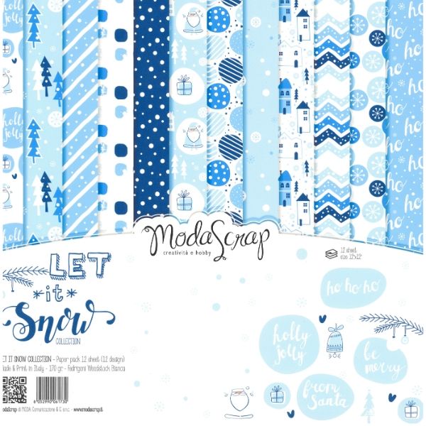 Le fantasie di Let It Snow Collection sono un disegno esclusivo di Moda Scrap. La stampa (solo su un lato) è su carta di altissima qualità Fedrigoni Woodstock bianca da 170 g/m2, riciclata (80% da fibre di recupero e 20% di pura cellulosa ECF), colorata nell'impasto con pigmenti resistenti alla luce e con finitura liscia.