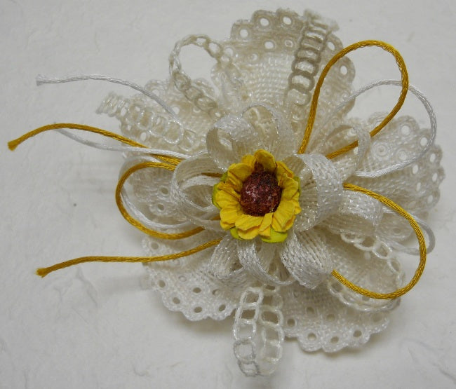 Portaconfetti "Ibisco". Nastro in tessuto tipo juta color sabbia con 5 tasche nelle quali si inseriscono i confetti. Si stringe con il tirante posto alla base e si forma così una margherita (immagine dell'esempio bomboniera).