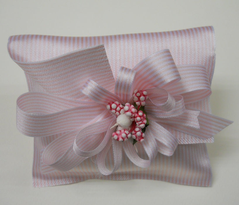 Portaconfetti "Millerighe", sacchetto in tessuto di raso a righe. Il sacchetto misura cm 10,5 x cm 18. La particolarità è che è tutto chiuso e può essere aperto in alto o sul retro (a seconda della confezione che si vuole realizzare) per permettere l'inserimento del tulle con i confetti.