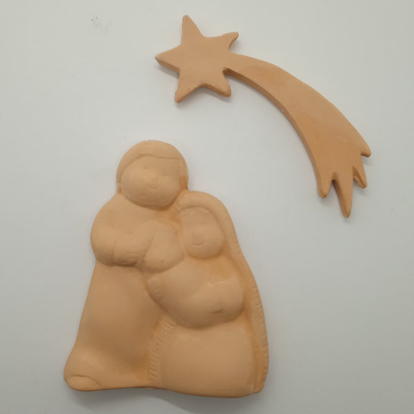 Presepe e Stella Cometa in terracotta. La Sacra Famiglia (in un solo pezzo) è alta 8 cm, la Stella Cometa è lunga 8 cm