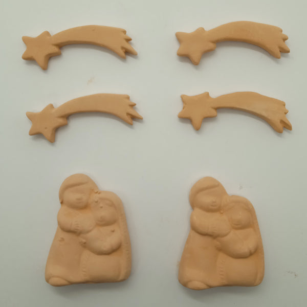 2 Presepi e 4 Stelle Comete in terracotta. La Sacra Famiglia (in un solo pezzo) è alta circa 4 cm, la Stella Cometa è lunga 4,2 cm